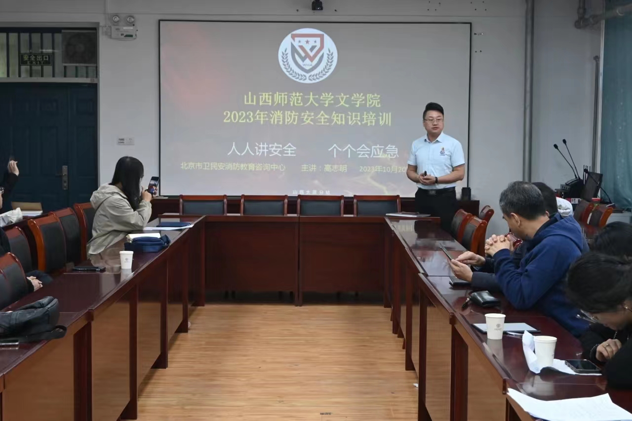 在院会议室开展2023年消防安全知识培训。本次培训由校保卫部推荐,消防志愿杰出青年,红十字会救护员高志明主讲,副院长段俊主持本次会议,学院部分老师参会。