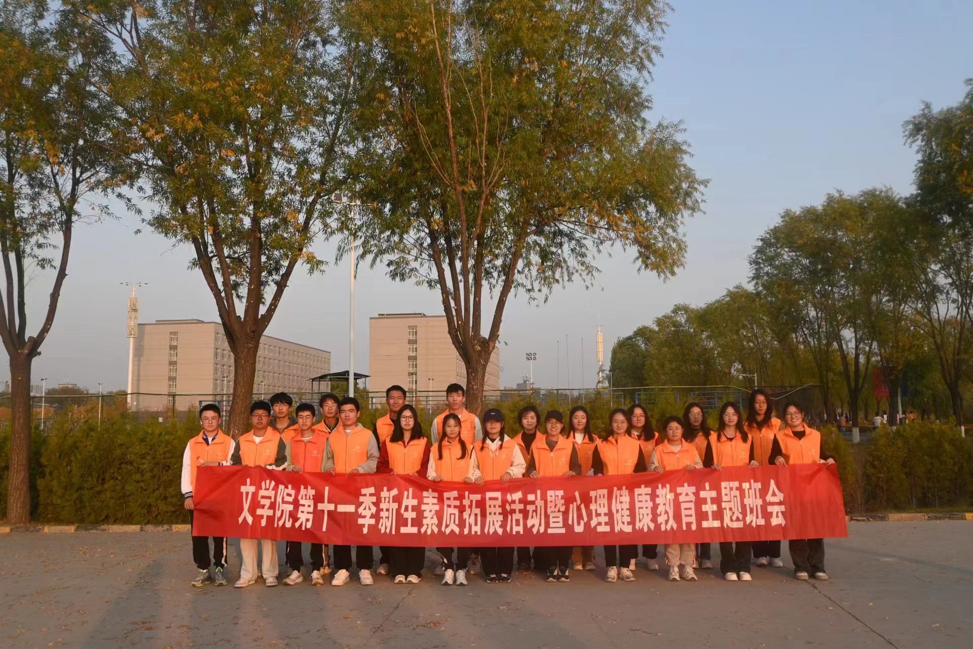 在北区操场西侧空地举办第十一季新生素质拓展活动,活动以“凝‘新’聚力,青春起航”为主题,26位素拓师及23级全体新生参加。