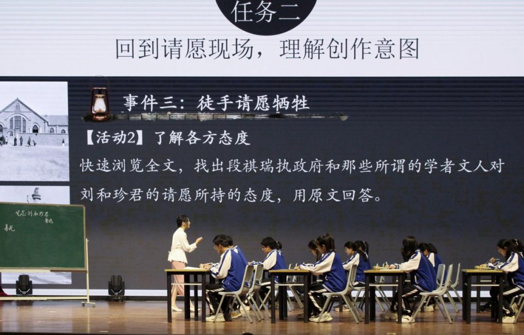 教学展示环节中,授课学生和嘉宾老师同课异构,各表一枝,精彩纷呈。王珂悦通过特色情境引入,带领同学们回到历史,深入感受和理解“过去的暴行,现在的真相”从而结尾回应时代呼吁,引出“未来的选择”。刘天宇另辟蹊径,抓住文章细节进行细致分析,并与朱自清笔下的喷涌、宣泄对比,带领学生感悟鲁迅节制、冷静的笔调下至情与厚重的至理。芝欣通过表格梳理的方式来回顾内容,对文中所记叙的事件一一分析,探究人物形象。并且通过短句分析,让学生深入领悟鲁迅先生细腻的笔触与真挚的情感。威光宇从学生角度出发,收取学生问题卡片,对学生“真正”的困惑作出针对性解答。并通过“是什么、为什么、怎么做”这一经典思路,对文章进行全面分析与梳理。