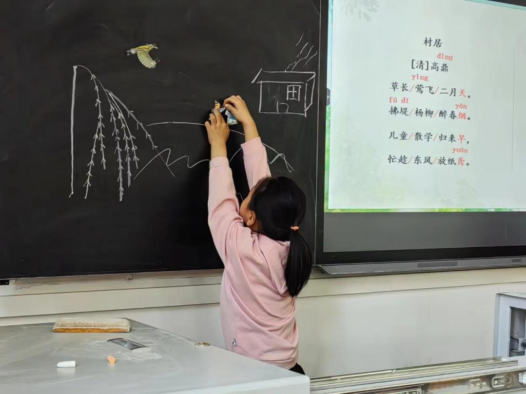活动中,红烛文学社负责人2101班党子妍向小朋友们讲解了《村居》和《钱塘湖春行》这两首古诗,指出读诗要“读准确,有节奏,有味道”,并逐字逐句进行分析讲解,让小朋友们能够充分理解。随后她带领小朋友们一起绘制了“春日村居图”和“钱塘春行图”,在绘制两幅图时,党子妍设置了若干巧妙的问题进行提问,引导小朋友们说出自己的观点,并鼓励小朋友在黑板上自己动手画。小朋友们展现了自己丰富多彩的想法,并在课堂上积极互动。接着在志愿者的组织下,小朋友们一起朗读诗句,在充分理解诗歌的内容前提下熟记诗歌内容。在手绘风筝环节,小朋友们将课堂上学到的知识运用到实践中去。小朋友们充分发挥想象力和动手能力,用颜料为风筝涂色,用画笔绘出心中所想。活动最后,小朋友们带着自己的手绘风筝与志愿者们合影留念,活动圆满落下帷幕。