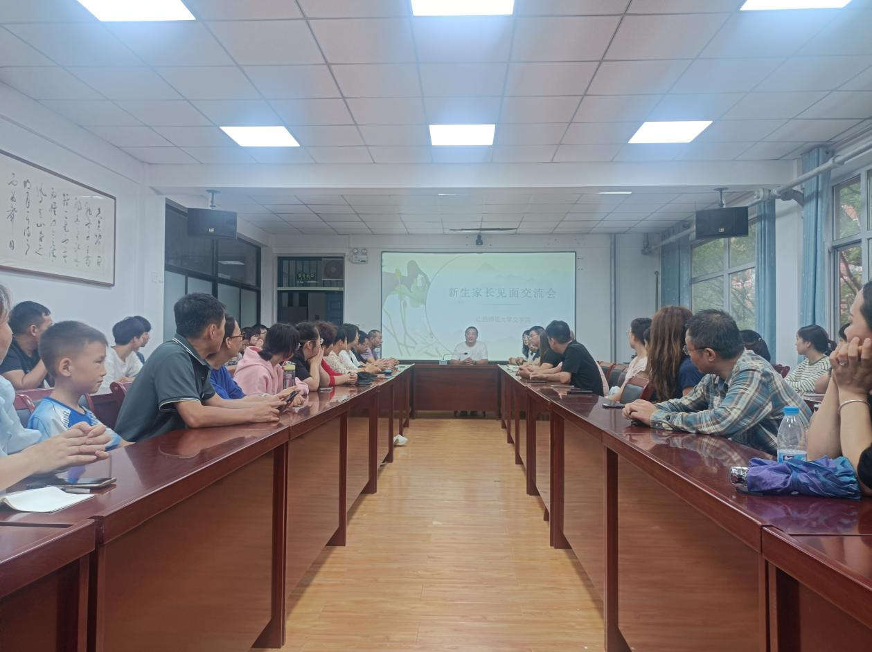 党委书记钱成主持,副院长段俊、李晓敏、关黑拽,中文系主任严艳群出席会议,2023级部分新生家长参加。
