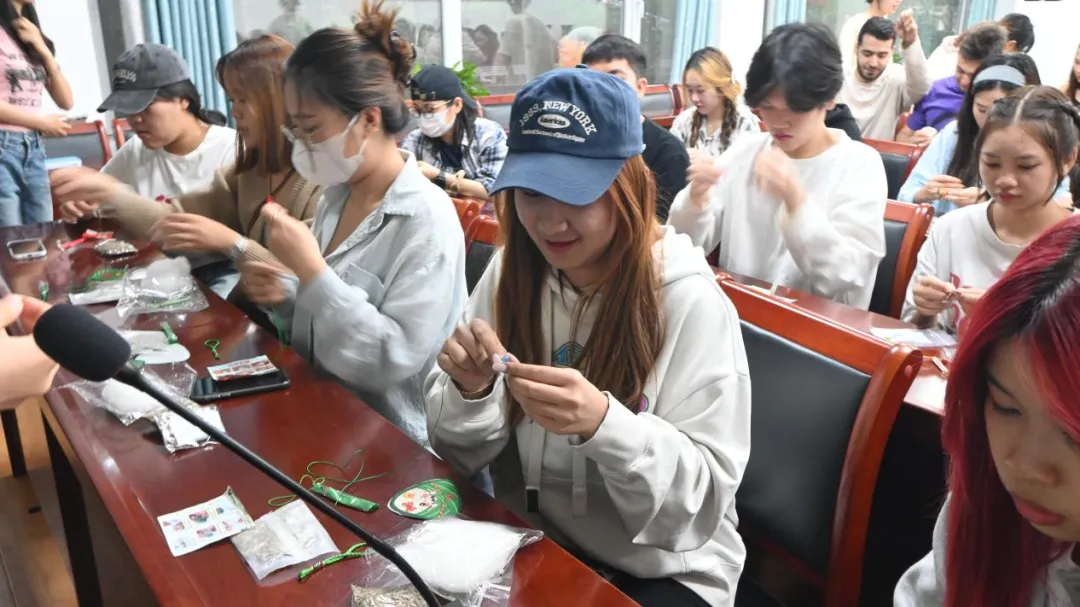 活动开始,夏若晨向留学生们详细讲解了端午节的起源、传说以及相关的风俗习惯,让他们对端午节有了更深入的了解。随后,吕树明和王国明吟诵端午主题诗歌,深邃的思想和优美的辞藻,深深触动着每一位在场者的心灵。肖雅和孟豪杰进行诗词朗诵,带领留学生深刻感受中华文化的博大精深。在编彩绳和制作香囊的环节,留学生们兴趣盎然。伴随志愿者的指导和协助,他们制作出玲珑夺目、立体饱满的香囊,编织出一条条寓意吉祥、美观大方的彩绳,为节日氛围增添了浓厚的色彩。最后,大家一起品尝端午传统美食粽子,一边吃一边听老师介绍粽子的制作方法、粽子的种类及南北方粽子的差异。