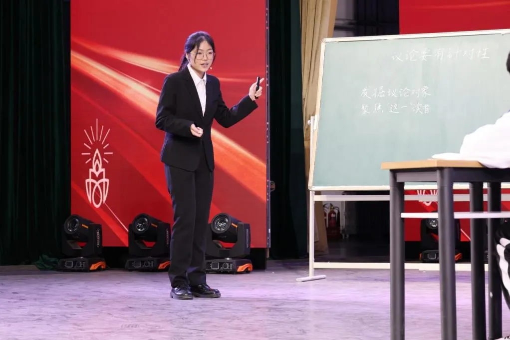 22级学生王琪围绕“议论文写作要有针对性”展开师生同课异构主题教学研讨。