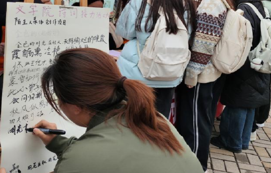 神舟诗社在南区6号楼前举办了“秋意浓·诗词接力创作”活动,600多名同学参加。