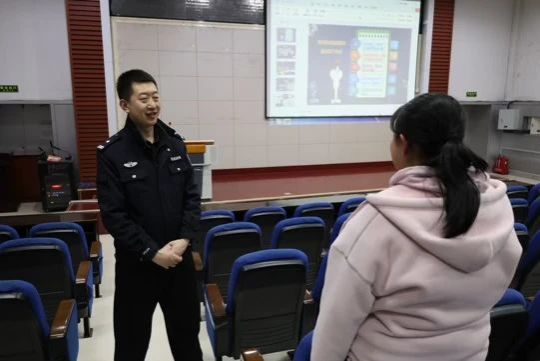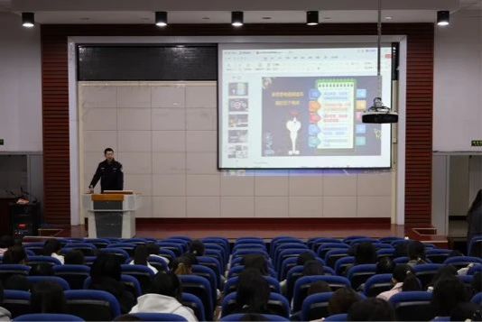 学工组在南区实验楼报告厅举办“防范电信诈骗”专题安全教育讲座,驻校民警裴警官主讲,真人漫画