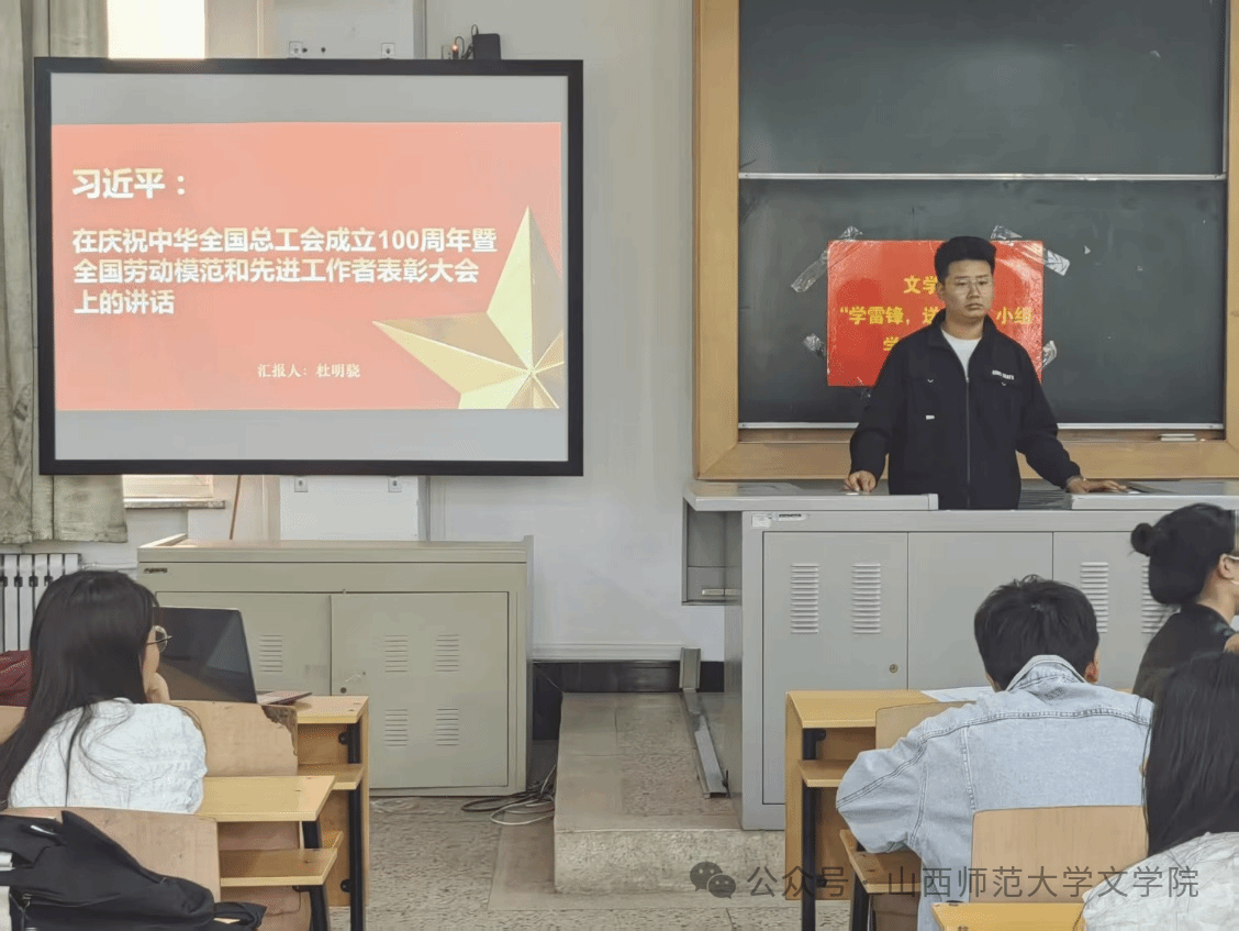 “学雷锋,送温暖”小组学生党支部在南区3107教室组织开展学习习近平总书记在庆祝中华全国总工会成立100周年暨全国劳动模范和先进工作者表彰大会上的讲话主题党日活动,支部全体党员和积极分子参加。杜明骁同志担任主讲人。