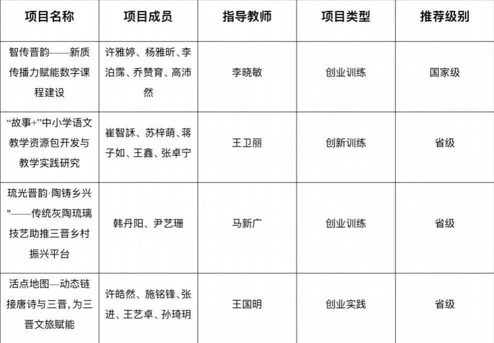 其中,李晓敏老师指导的“智传晋韵——新质传播力赋能数字课程建设”项目入选国家级大创一般项目,该项目聚焦晋韵文化的数字化传播,通过新质传播力为数字课程建设注入新活力;王卫丽老师指导的“‘故事+’中小学语文教学资源包开发与教学实践研究”,致力于开发创新型语文教学资源,为中小学语文教育提供有力支持;马新广老师指导的“琉光晋韵·陶铸乡兴——传统灰陶琉璃技艺助推三晋乡村振兴平台”,以传统工艺为切入点,探索文化传承与乡村振兴的融合发展路径;王国明老师指导的“活点地图—动态链接唐诗与三晋,为三晋文旅赋能”,创新性地将唐诗资源与三晋地域文化相结合,助力地方文旅产业发展。