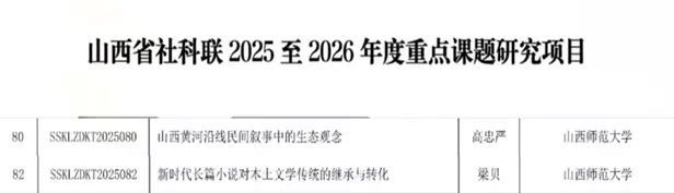 山西省社科联年度重点课题聚焦区域发展、文化传承等关键领域,是推动社科研究服务地方建设、助力学术创新的重要平台 。学院长期重视科研培育,鼓励教师深耕学术、关注地方文化与时代文学发展,从选题打磨到申报推进,给予全方位支持。这两项课题聚焦山西生态观念挖掘与文学传统创新,既贴合学术前沿,又服务地方文化建设与文学发展需求,有望为山西文化研究、文学传承注入新活力,助力讲好山西故事、推动学术创新。