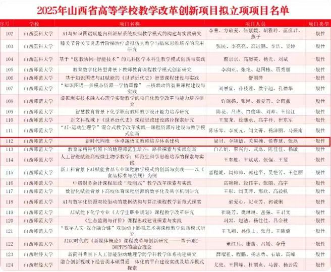 教师梁贝、李晓敏、关黑拽、侯春慧、张磊团队项目《新时代四维一体卓越语文教师培养体系建构》成功入选2025年山西省高等学校本科教学改革创新一般性项目名单。该项目立足新时代语文教育发展需求与卓越教师培养目标,聚焦当前语文教师培养中存在的体系化不足、实践衔接不紧密等问题,提出“四维一体”培养框架,对优化语文专业课程设置、完善人才培养评价机制具有探索意义。
