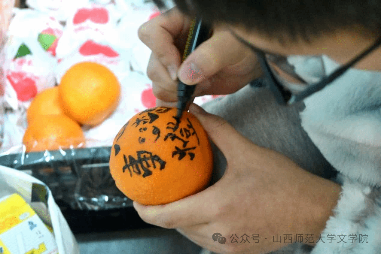活动筹备阶段,志愿者根据考研学子备考实际需求,准备了橙子、巧克力、考试用具等物资,并在橙子上绘制图案、书写祝福语。相关物资完成打包后,志愿者于当晚前往宿舍楼,将物资礼包逐一送至考研学子手中,并与学生进行面对面交流,让备考学子切实感受到校园的暖心支持。
