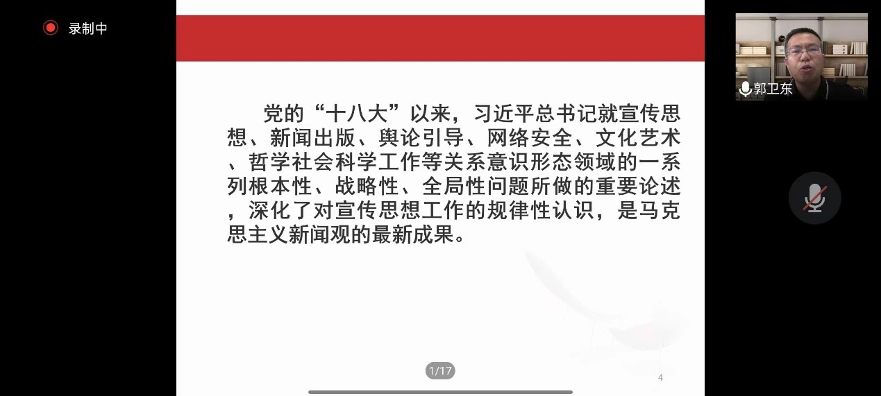 在线上举办了“实践中的马克思主义新闻观”专题讲座。本次讲座邀请到山西传媒学院副院长、教育部高等学校新闻传播类专业指导委员会委员郭卫东教授进行讲授,来自各学院400多人聆听了本次讲座。