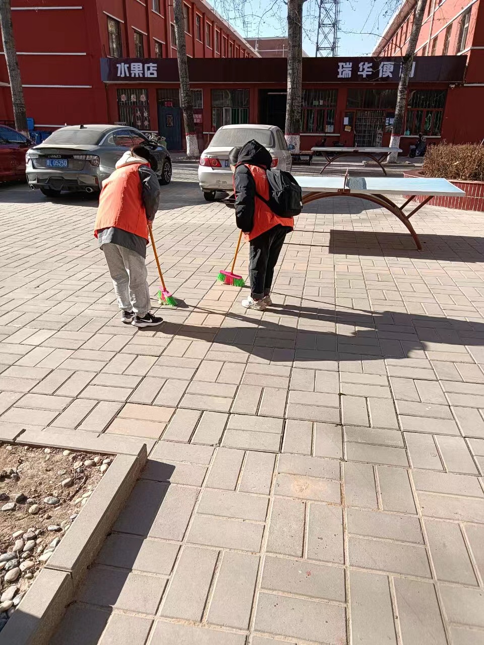 “学雷锋,送温暖”小组根据校团委划分的打扫区域,开展校园打扫活动。
