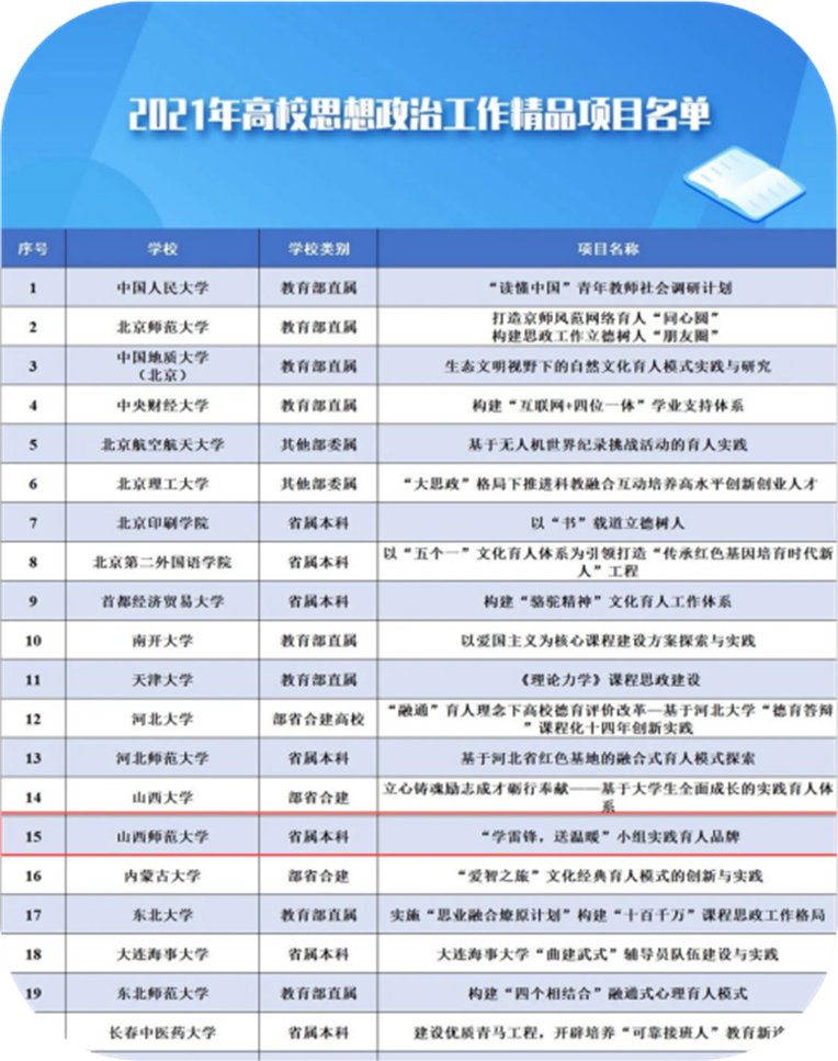 2021年3月,“学雷锋,送温暖”小组实践育人品牌入选2021年高校思想政治工作精品项目。