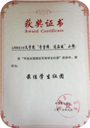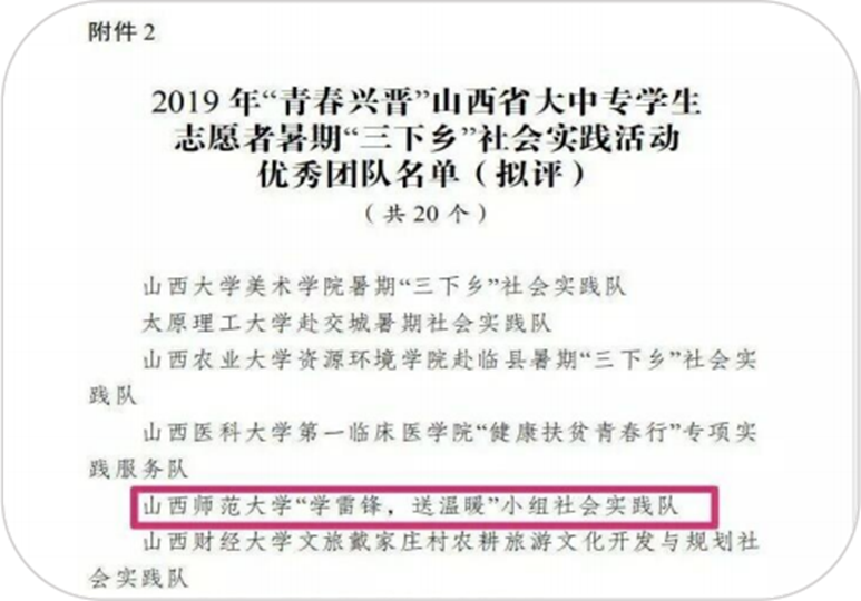 2019年12月,“学雷锋,送温暖”小组社会实践队被共青团山西省委评为“青春兴晋”山西省大中专学生志愿者暑期“三下乡”社会实践活动优秀团队。