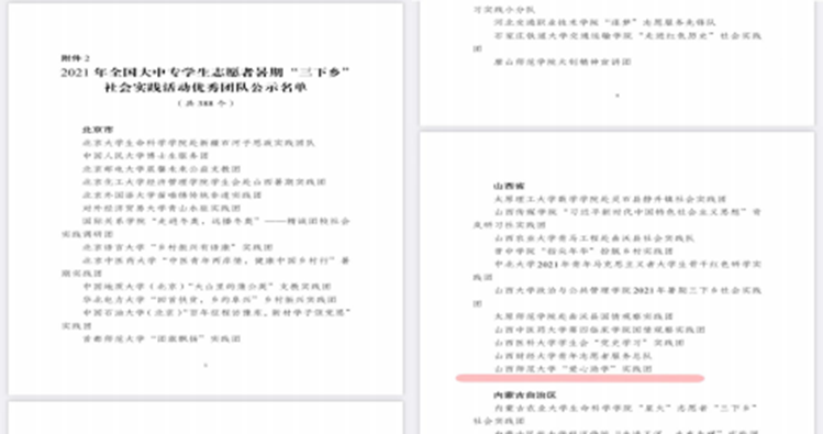 2021年10月,”学雷锋,送温暖“小组线上”爱心助学“志愿服务项目被评为2021年山西省大中专学生暑假文化科技卫生”三下乡“社会时间活动”示范项目“。