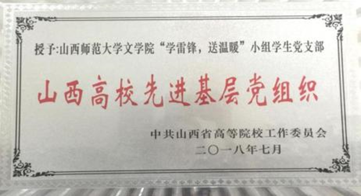 2018年7月,“学雷锋,送温暖”小组学生党支部被山西省高等院校工作委员会评为“山西高校先进基层党组织”荣誉称号。