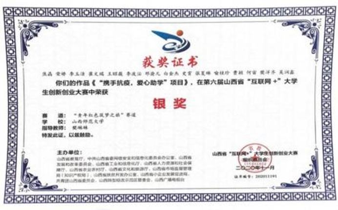 2020年11月,《“携手抗疫,爱心助学”项目》在第六届山西省“互联网+”大学生创新创业大赛—“青年红色筑梦之旅”赛道中荣获银奖。