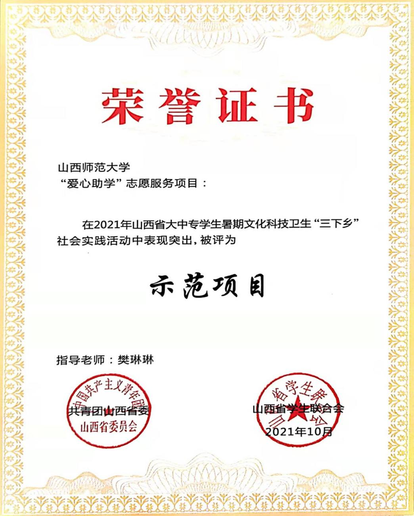 2021年10月,“学雷锋,送温暖”小组线上“爱心助学”志愿服务项目被评为2021年山西省中大专学生暑假文化科技卫生“三下乡”社会实践活动“示范项目”。