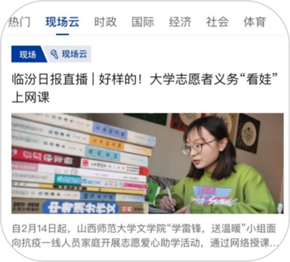 2020年4月30日,刊登报道《好样的!大学志愿者义务“看娃”上网课》。